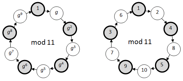 This can be illustrated by the following diagram for p = 11 (with the concrete example g = 2).