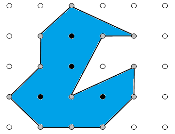 A lattice point on the cartesian plane is a point where both coordinates are integers. Let P be a polygon on the cartesian plane such that every vertex is a lattice point (we call it a lattice polygon). Pick’s theorem tells us that the area of P can be computed solely by counting lattice points: