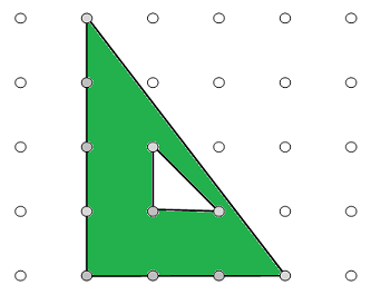 The polygon can be of arbitrary shape and size, concave or convex, but it mustn’t have a hole in it. For example, in the diagram below, the area should be 11/2 and not 9/2. To achieve the right formula, each hole contributes a value of +1 to the equation. This means that Pick’s formula is sensitive to the topology of the diagram (which reminds us of Euler’s V-E+F formula, but that’s another story for another day).