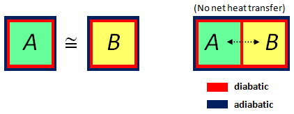 Now, a stand-alone system may exchange energy with the environment in the form of heat. A system is said to be adiabatically sealed if no such exchange takes place. A wall separating two systems is said to be diabatic if heat exchange can take place – however, the presence of the wall means material exchange does not occur. In short: diabatic = possible heat exchange; adiabatic = no heat exchange. In both cases, particles don’t cross the wall.