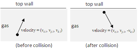 Assuming there’s no gravity effect, the three terms are identical by symmetry since nature has no preferred direction. We thus get: . Next, since the gas is homogeneous, the pressure on the top/bottom wall is given by P. To compute P in terms of the microscopic state, consider a single particle hitting the wall and having an elastic collision.