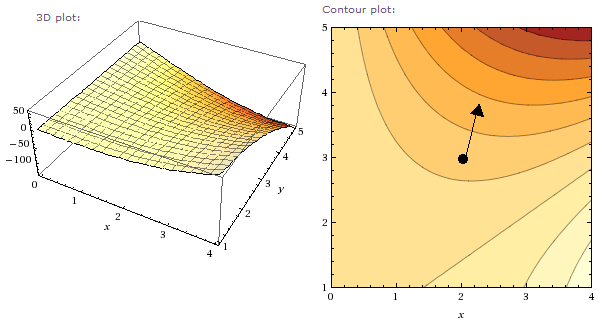 Example 5. For the equation in example 3, consider the point (x, y) = (2, 3) as above. Let’s find the direction with the steepest angle of ascent/descent. For a slight perturbation δx and δy in x and y, consider the length of this difference: . The steepest direction is the one where δz is maximal across all fixed ε.