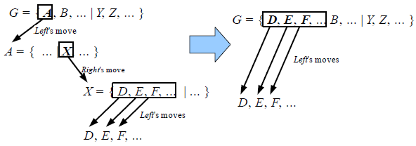 The idea behind the replacement is that if Left makes the move G → A, then it does not hurt for Right to make the move A → X. Hence, we can replace the option A by all Left options of X to obtain the resulting game.