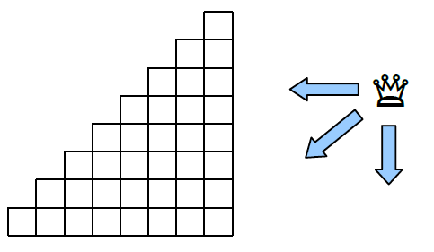 - Consider the following Wythoff’s Queen game on a non-square board. Start with exactly one Queen. At each player’s turn, he picks up the Queen and moves it in one of the three indicated directions, any positive number of squares. The player who lands the Queen on the bottom-left hand corner wins, since the opponent is unable to make any move. Indicate whether each of the following 36 positions is winning or losing. (10 points)
