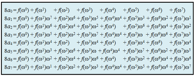 That’s where discrete Fourier transform comes in. Suppose we wish to multiply two polynomials whose product has degree at most 7. Thus, only 8 values of xi are needed. The values we’ll pick are the 8-th roots of unity: