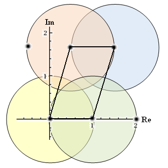 Now draw a circle of radius 1 around each of the points A(0, 0), B(1, 0), C(α, 0), D(1+α, 0), where α = (1+√-11)/2. Every complex number can be written in the form q+s, where and s lies in ABCD. Since the four circles cover the parallelogram, it follows that we can pick s such that |s| < 1.