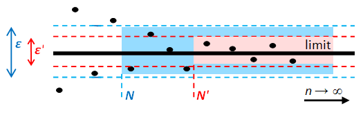 - for every positive real ε, there exists N, such that whenever n>N, we have |an – L| < ε.