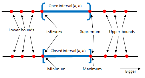 Example. The open interval (0, 1) is bounded but has no maximum or minimum. On the other hand, its infimum is 0 and supremum is 1. The closed interval [0, 1] has maximum (and hence supremum) 1.