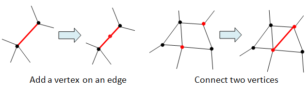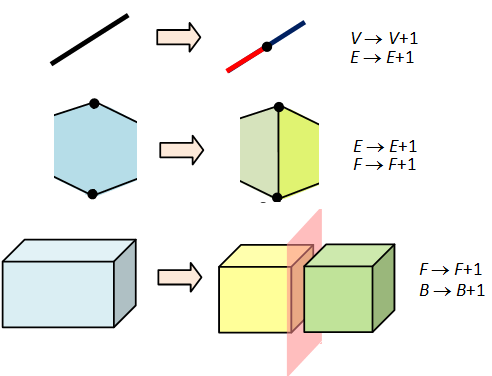 Thus, for a general geometric object, we can add a vertex to break an edge into two, or an edge to break a face into two, or a face to divide a block into two, … , as illustrated by the following (B denotes the number of 3-dimensional blocks):