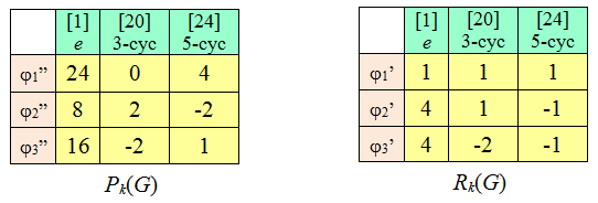 Removing the 2-singular conjugancy classes leaves us with the columns for e, 3-cyc and 5-cyc. Note that for any character χ so we are left with 4 rows. Next